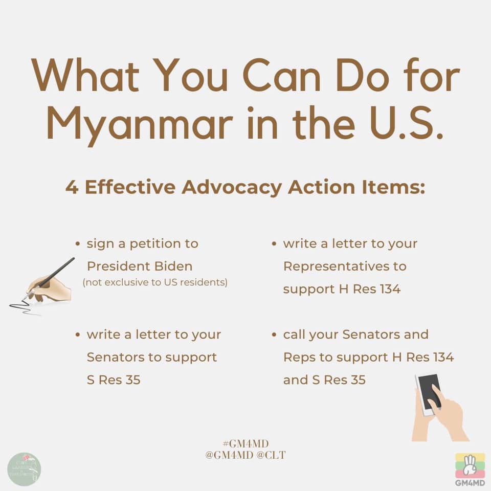 - Contact your senator or representative. Global Child Advocates created the graphic below. Political campaigns work and are a practical method to support those in Myanmar.
